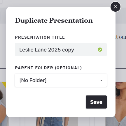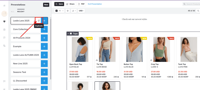 You can quickly create a copy of an existing Presentation to reuse its structure, product sections, and settings, saving you time when creating a new version.