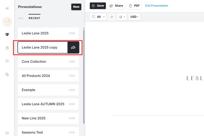 - On the left-hand panel, find the Presentation you would like to duplicate. Hover over the multiple page icon.