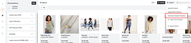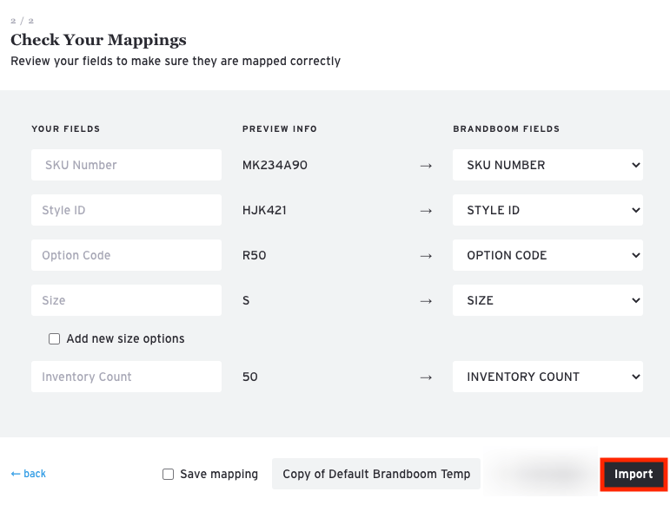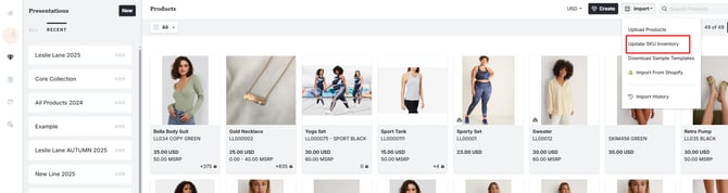 - To import the new inventory back into Brandboom. Go back to the products page. Click on the "Import" icon at the top right corner of the page and select "Update SKU Inventory"
