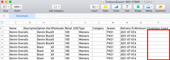 - Fill out the exported Excel file's "Inventory" column on the right side of the exported spreadsheet.