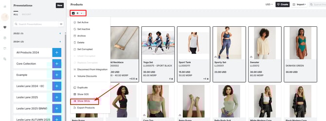 1. From the tile or list view, select the Styles you want to edit and click on the drop and select SKU.