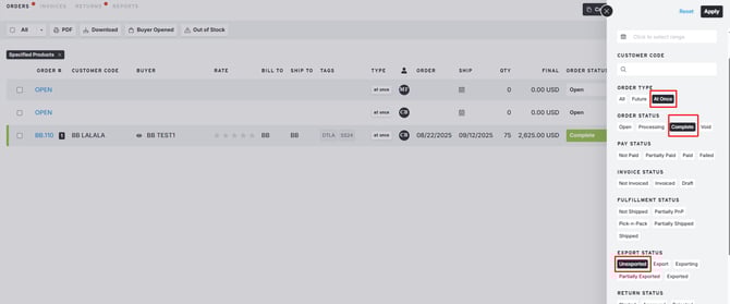 To narrow down your search to just the relevant orders, use the Filter panel on the Orders page.