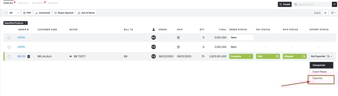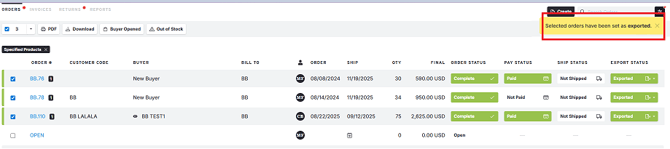 - A confirmation message will appear when the Orders are successfully Exported and their Export Status labels will be green.
