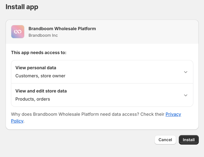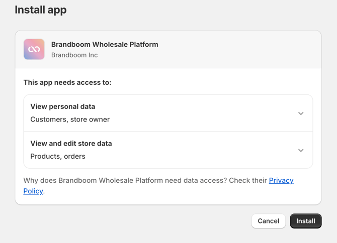 You will be redirected to Shopify's website. Log in to your Shopify account. If you haven't already, you will be prompted to install the "Brandboom B2B Wholesale App." Click 'Install' to integrate with Shopify.