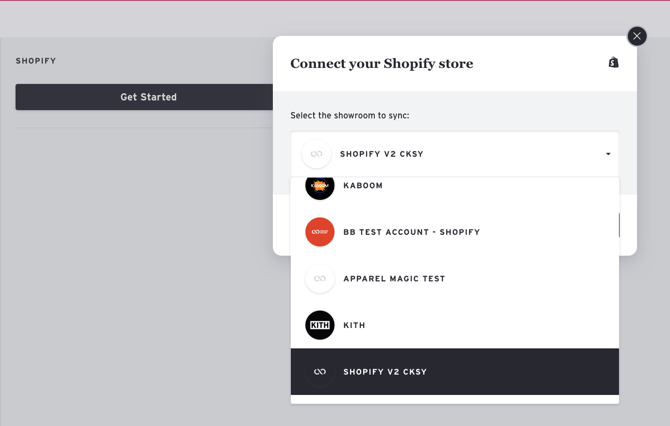 Click "Get Started" and select the showroom you want to connect Shopify to. Then, click "Set up on Shopify" to proceed to Shopify's website.