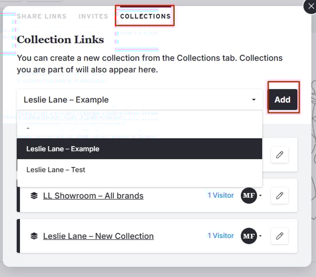 Once you’re in the Share Panel, go to the Collections tab, choose the correct collection from the dropdown menu, and click "Add".