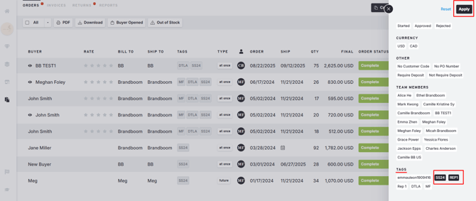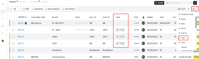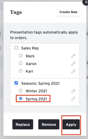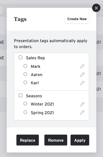Order Tags provide an essential way to manage and filter your Orders, helping you stay organized. You can apply a tag directly to an Order or set up Presentation Tags to automatically transfer over as Order Tags. This is useful when you need to group orders by status, buyer type, season, or any other custom criteria.