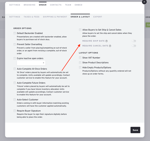 NOTE: To export wholesale prices and fees to Shopify, you must update Shopify's export settings. These settings can be found in Showroom Settings > Order > Order & Layout and Export.